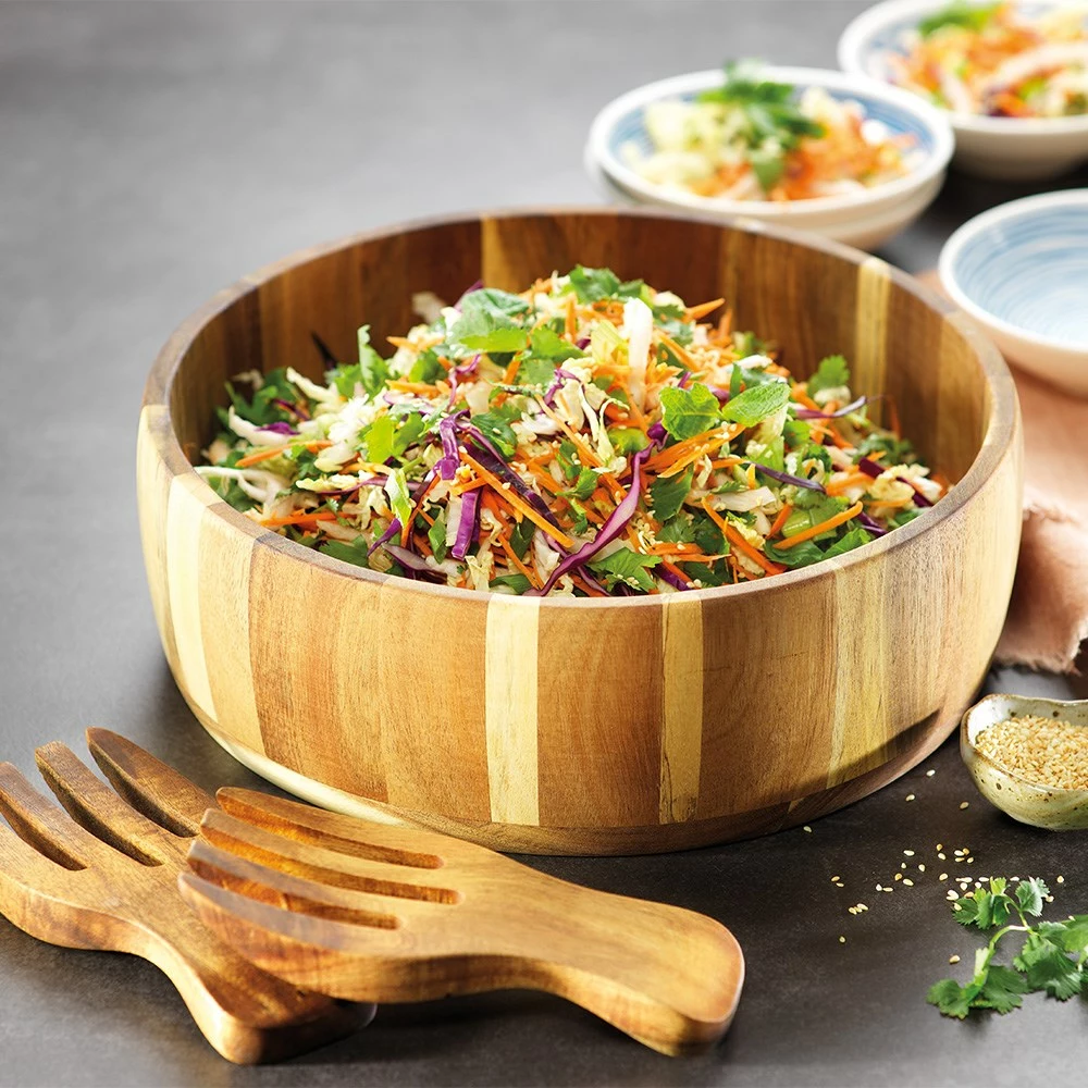 Make any salad or side dish appealing for your guests by serving them up in the Alex Liddy Acacia Round Salad Bowl with Servers