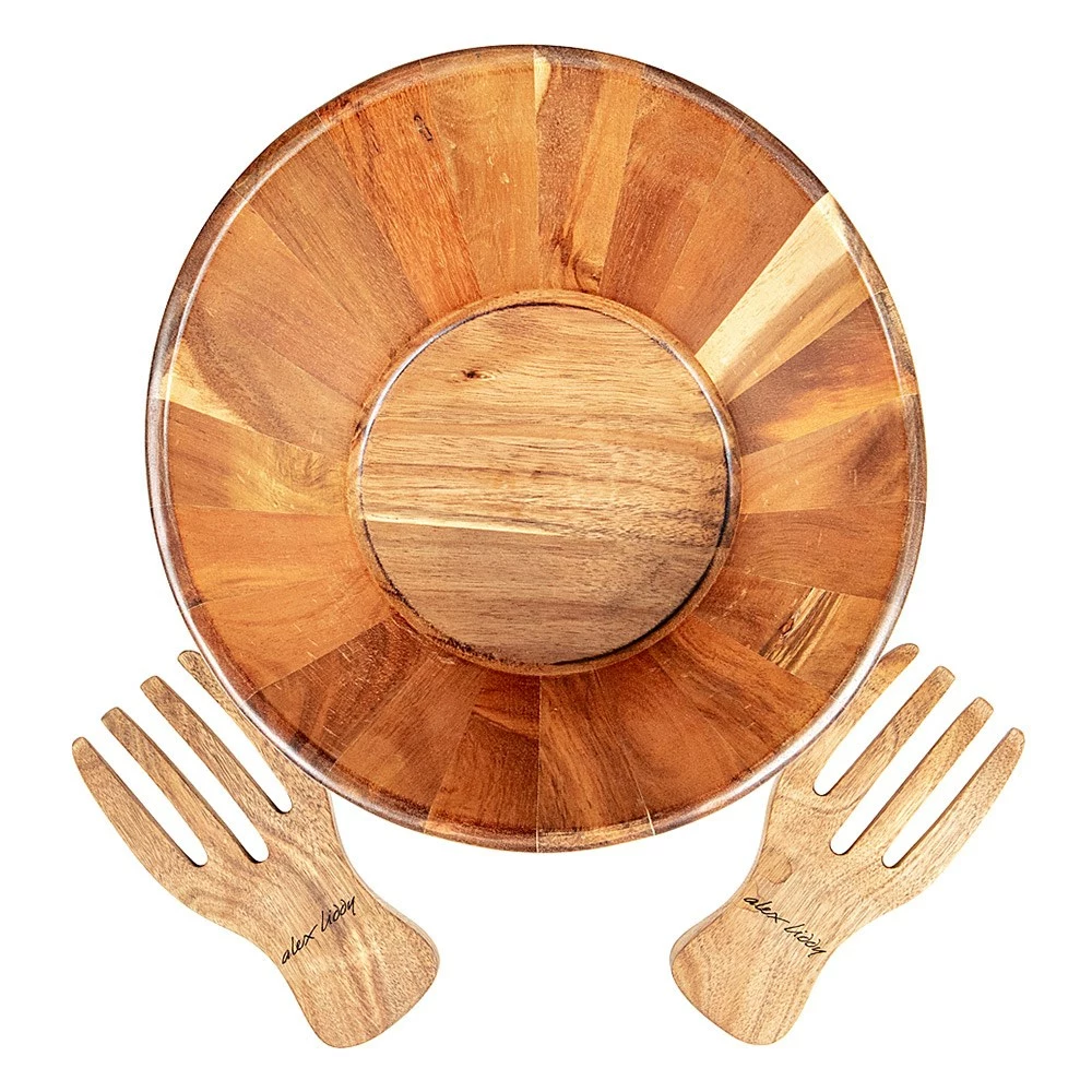 Make any salad or side dish appealing for your guests by serving them up in the Alex Liddy Acacia Salad Bowl with Claw Servers