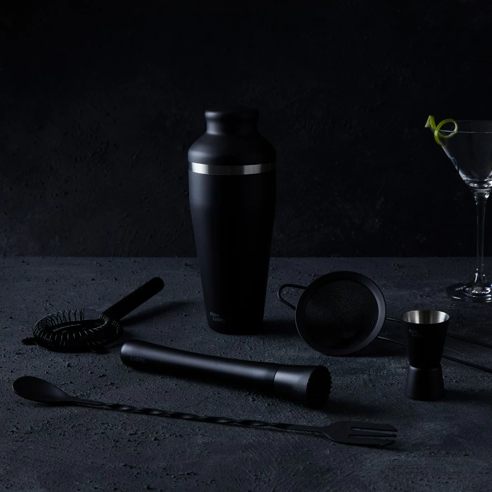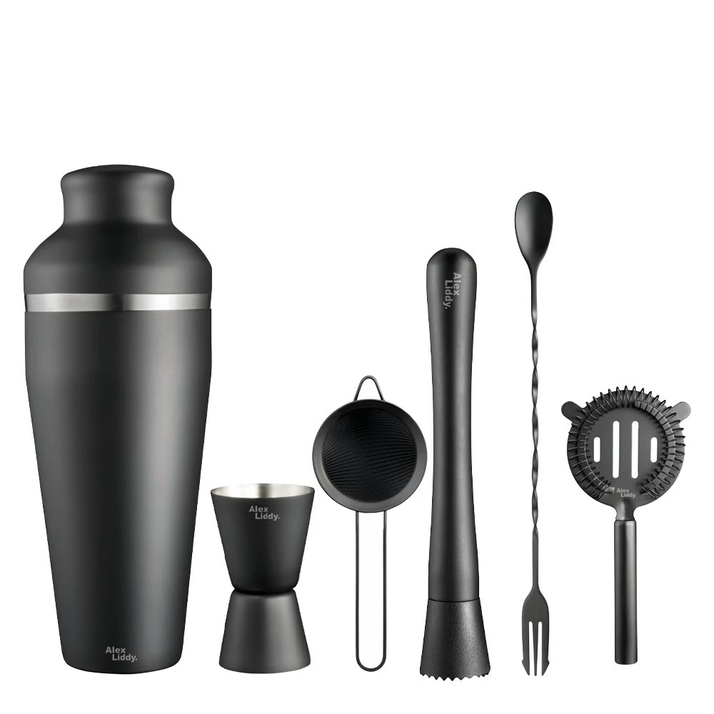 Create cocktails in style with the Slate & Co 6 Piece Cocktail Set from Alex Liddy. The Alex Liddy Slate & Co 6 Piece Cocktail Set includes all the essential items needed to create fabulous cocktails at home. Crafted in premium-quality stainless steel and an elegant matte black finish, you can shake, stir, measure, mash, and strain to perfection. Let your inner mixologist craft your own cocktail concoctions. Packaged beautifully, the Slate & Co 6 Piece Cocktail Set from Alex Liddy makes an excellent gift for any mixologist. To preserve the beautiful black finish, hand wash with warm soapy water only. Avoid the use of scouring pads and abrasive cleaners. Polish with a soft cloth.Â