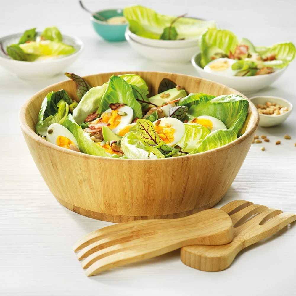 Make any salad or side dish appealing for your guests by serving them up in the Ambrosia Karira Bamboo Salad Bowl with Servers