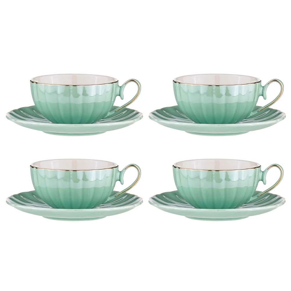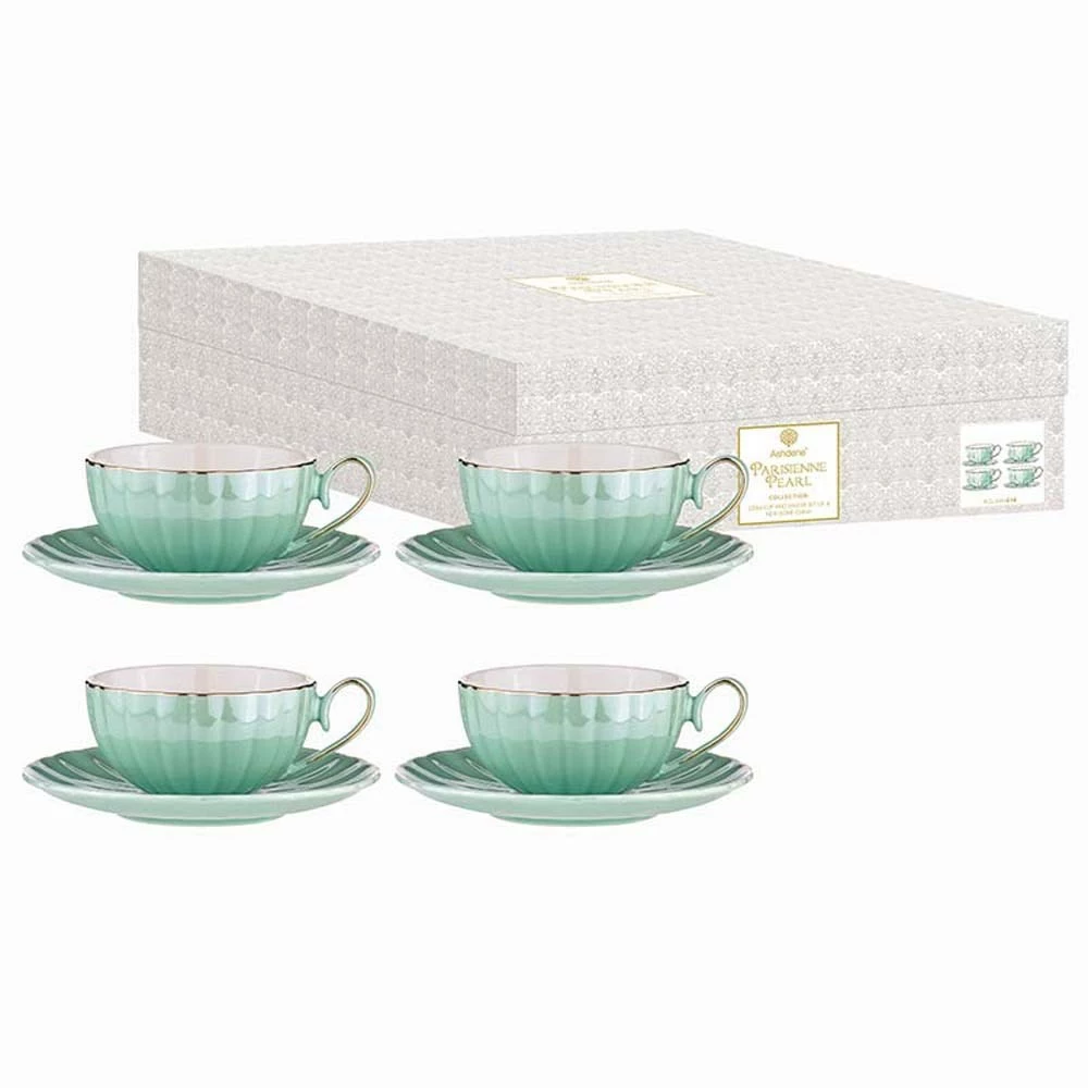 Infuse your tabletop with the chic French elegance of the Ashdene Parisienne Pearl 4 Piece Cup & Saucer Set Aquamarine