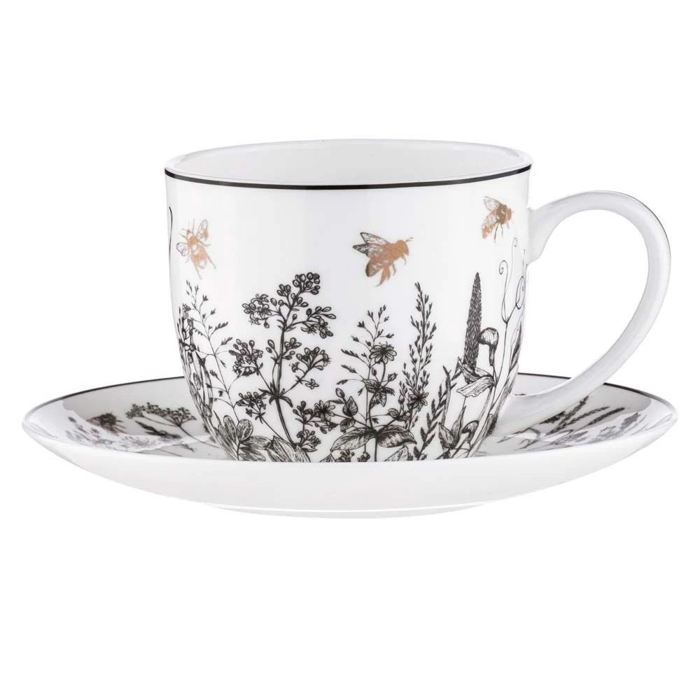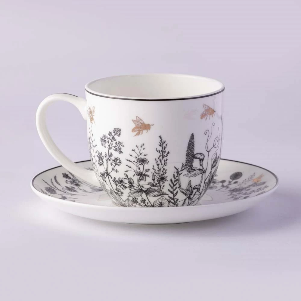 Delight guests with freshly steeped tea and home-baked biscuits served from the Ashdene Queen Bee Cup & Saucer 350ml. Overflowing with rustic elegance, the Ashdene Queen Bee Cup & Saucer 350ml displays an intricate fine-point illustration of wildflowers in a rich black tone that pop out from a fresh white backdrop. Refined style paired with premium durability is brought to the tabletop thanks to its quality new bone china construction. Graced with metallic gold honeybees at enchanting intervals, it’s hard to beat the unique design and luxury aesthetic of this cup & saucer. For a beautifully curated tea party, pair the Ashdene Queen Bee Cup & Saucer 350ml with more equally impressive pieces from the Queen Bee line.