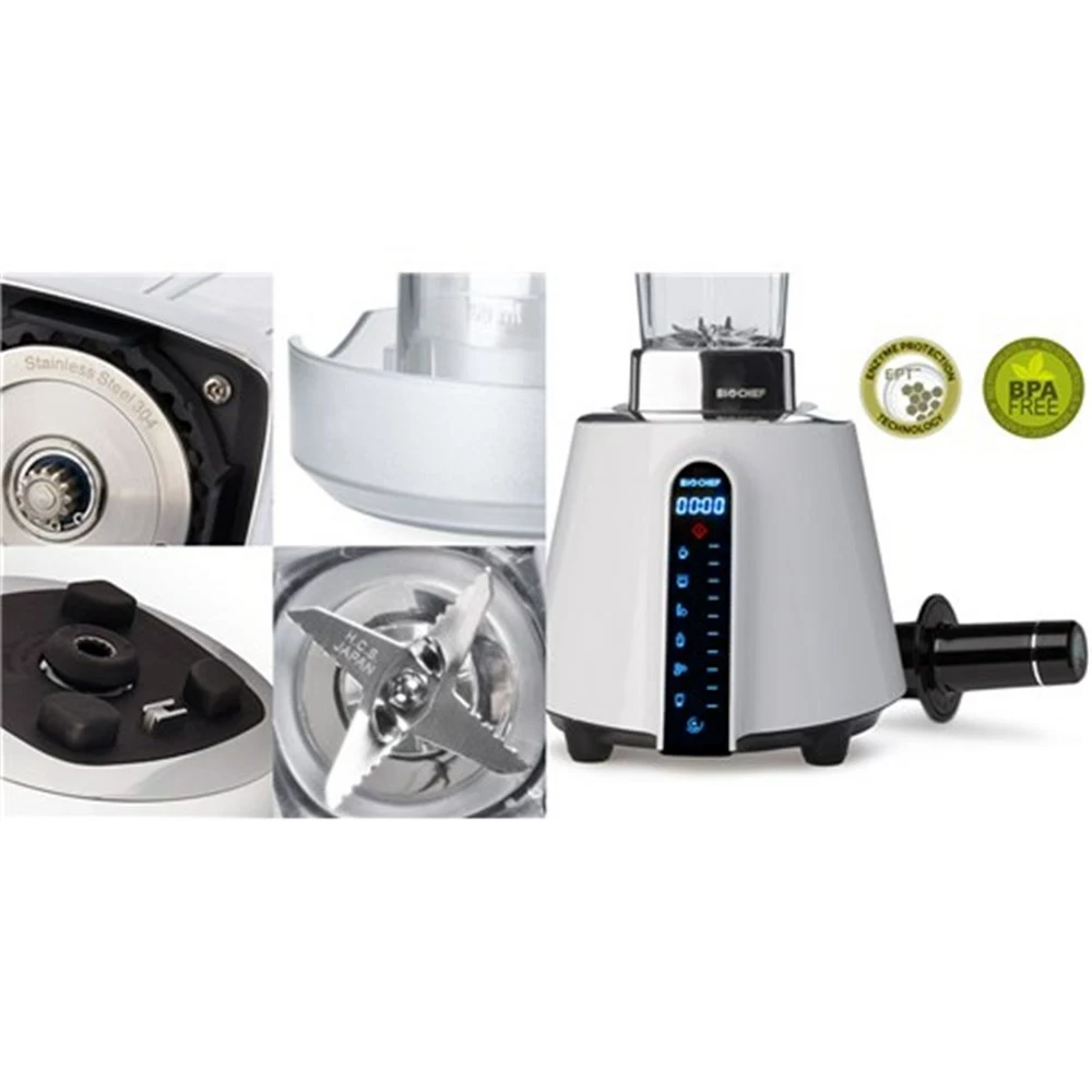 The BioChef Living Food Smart Blender in White is revolutionary. It features LED Touch and Swipe Panel Technology, which makes using the blender simple as all the features are at your fingertips. There are 6 pre-set programs that are used for various tasks and this allows the on-board microprocessor to adjust its speed and power depending on the ingredients and to also to give the best results for what you are trying to create. 10 manual speed settings that can be adjusted with the swipe of your finger. The BioChef Living Food Blender uses a Japanese Stainless Steel blade system, which is durable and effective and this is powered by a 2 horsepower motor working at 32,000 RPM. The combination of power, speed and blade structure which enables the blender to break open the cellulose wall or structure of fruits and vegetables and release deep phytonutrients to make them more bio-available for the body to use. Tough BPA-Free Tritan jug is virtually unbreakable and is heat resistant up to 120 degrees Celsius whilst still being easy to clean. This blender is geared up for the raw food approach to eating since it includes a unique tamper stick that doubles as a temperature gauge. This means you can ensure your food is not heated of 46 degrees Celsius for maximum nutrient retention. This, along with inbuilt Enzyme Protection Technology ensures the maximum amount of nutrients remain in your blended food. A 10 year warranty on motor and 7 year warranty on parts offers peace of mind for your new purchase.