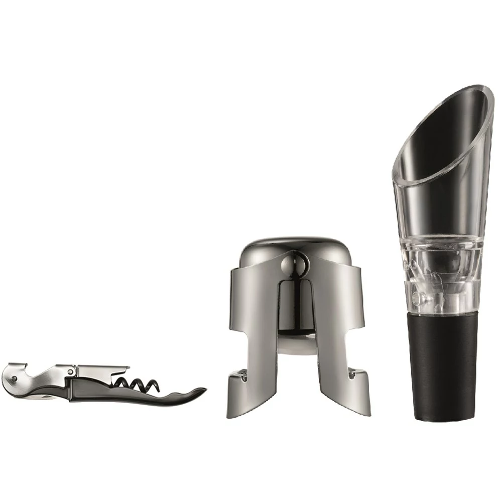 - Set features a bottle opener, stopper and a wine pourer