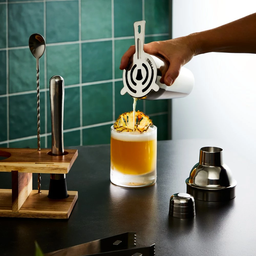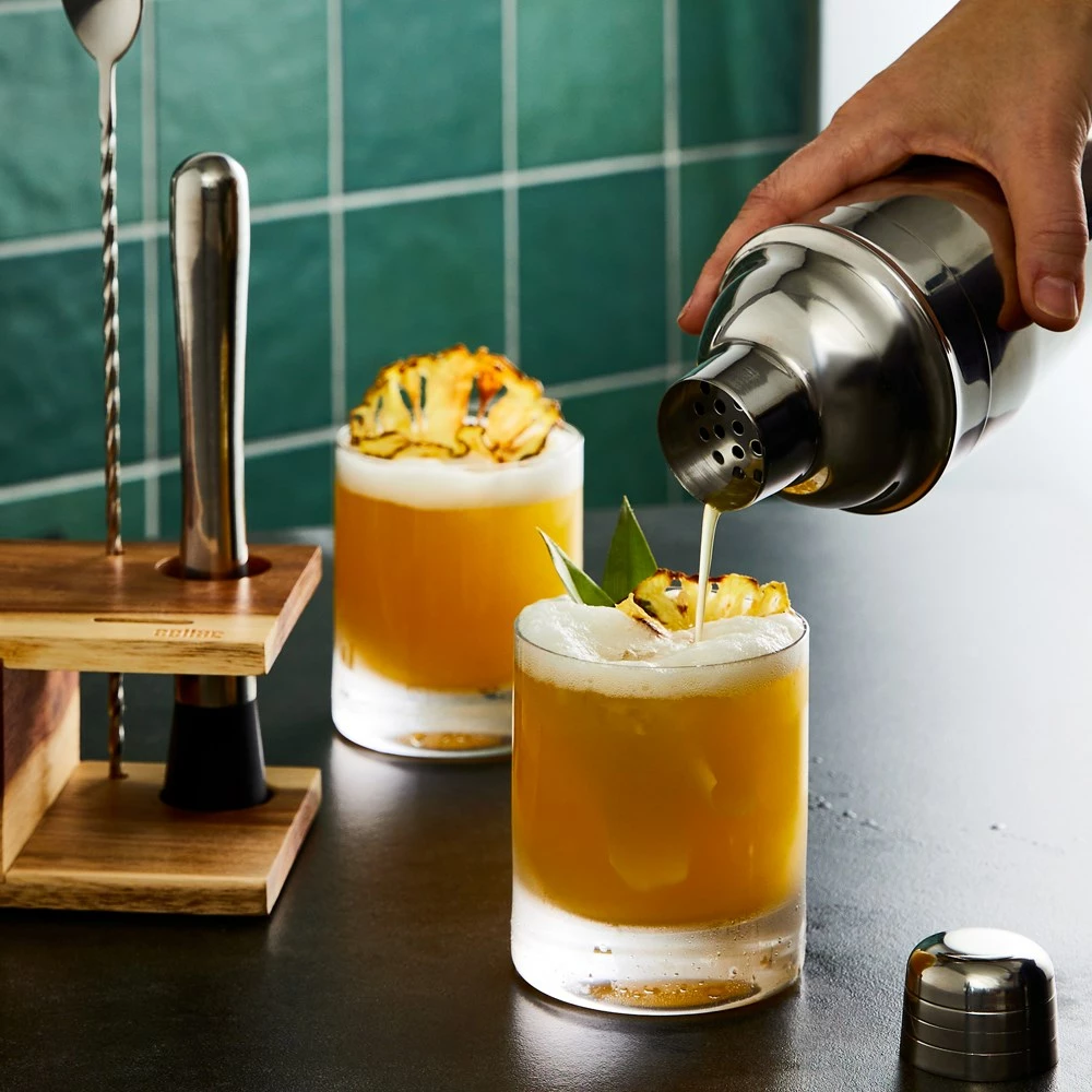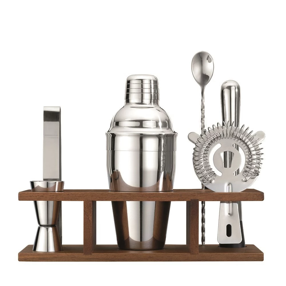 - Set comprises of 1x cocktail shaker, 1x cocktail strainer, 1x double jigger, 1x stirring spoon, 1x ice tongs, 1x muddler housed in a stunning Acacia wood stand