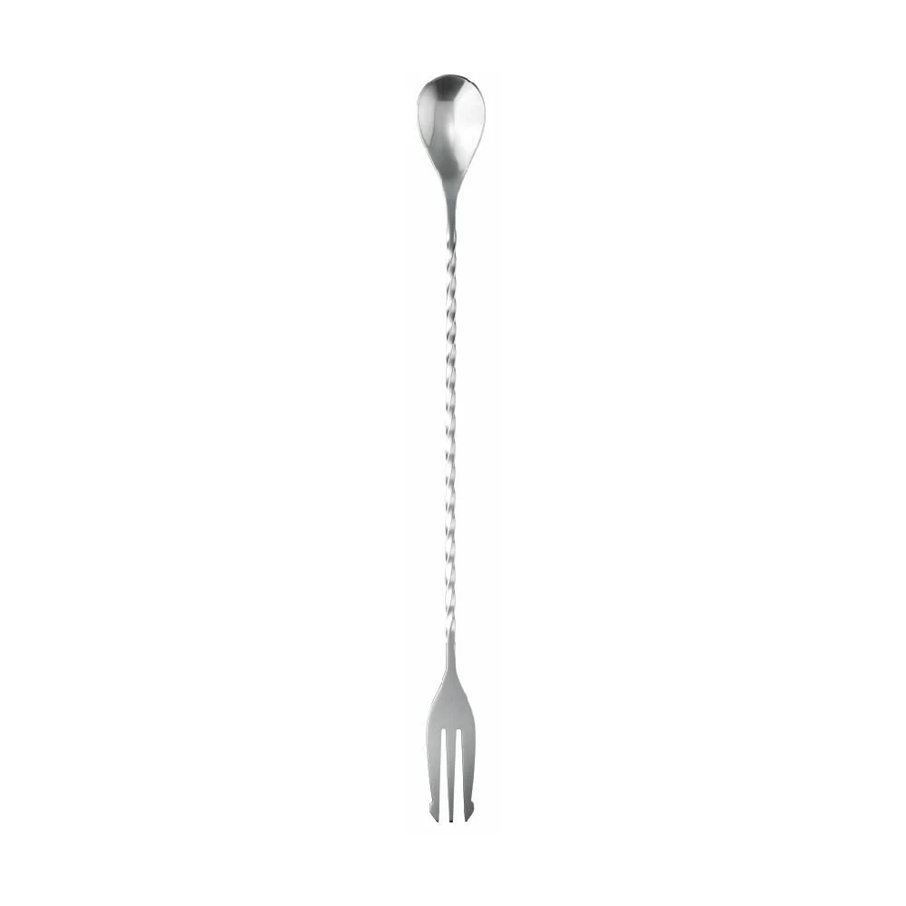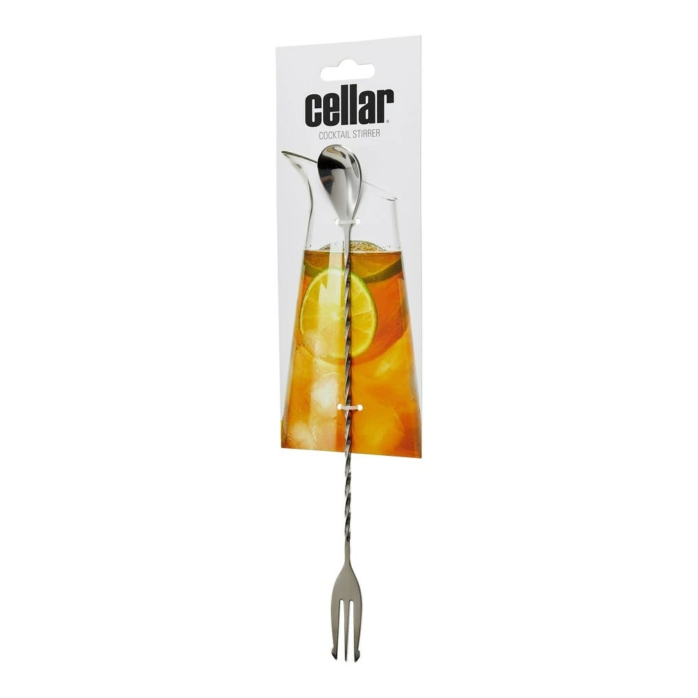 The Cellar Tonic Cocktail Stirrer is the essential bar tool for mixing cocktails and other beverages in jugs. Because of the lengthy 30cm length, which is ideal for reaching the bottom of the jug, your beverages will have consistent flavour all the way through when using the cocktail stirrer. The Cellar Tonic Cocktail Stirrer features a paddle spoon for drizzle pouring, which can be achieved by gently pouring over the back of the spoon to reduce splash back and create layered drinks. Use the trident fork to reach those hard-to-reach garnish pieces, and the twisted handle will keep your drinks fizzy by reducing the impact of stirring carbonated drinks. The Cellar Tonic Cocktail Stirrer is made of high-quality stainless steel which is easy to clean and makes it dishwasher safe.