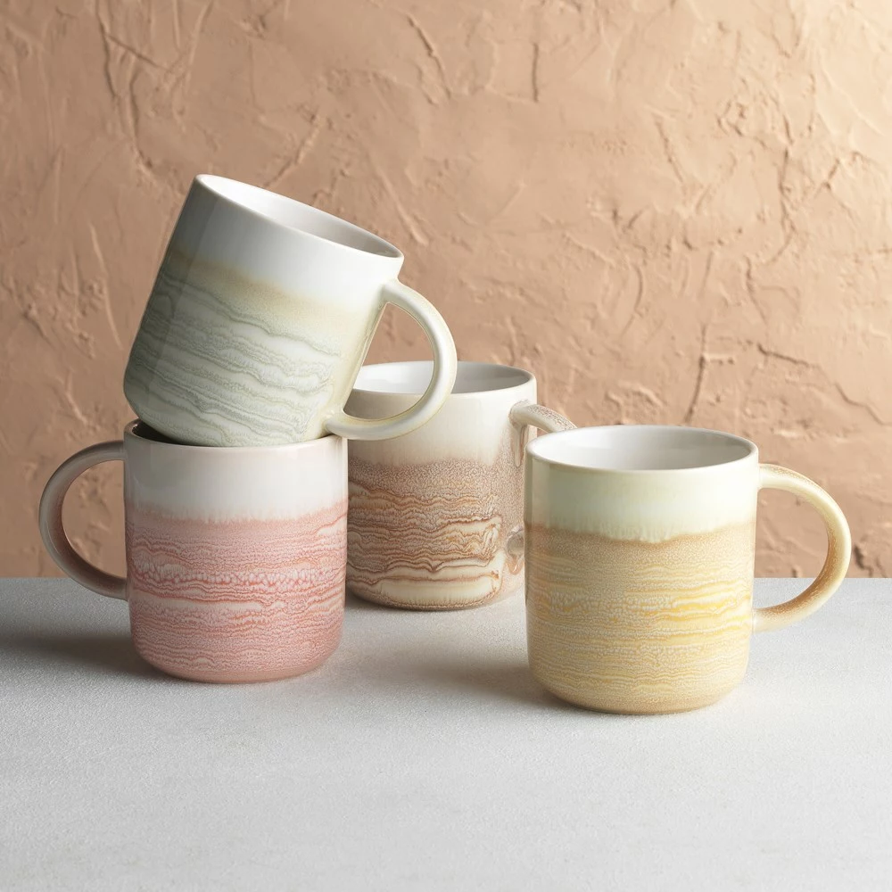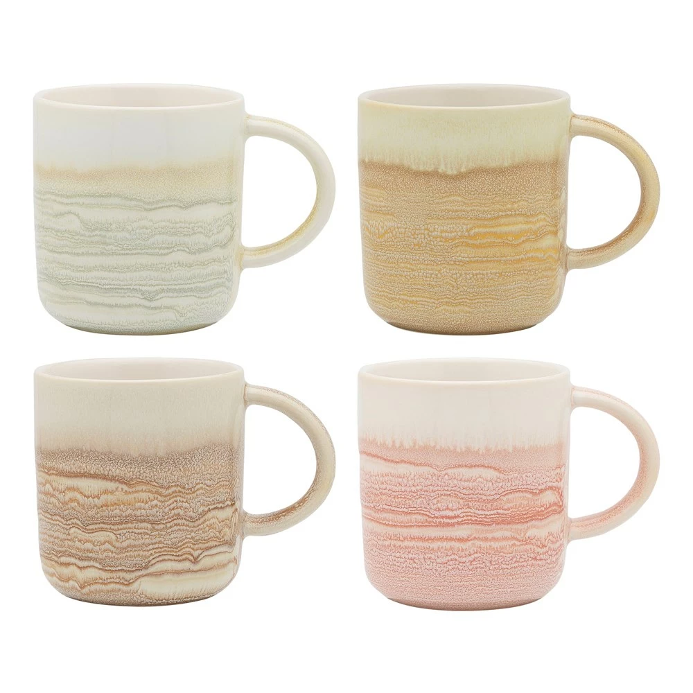 Embodying the stunning natural colours of Desert sand patterns, the Ecology Mirage Set of 4 Mugs 325ml offers a chic and inviting space to enjoy your favourite hot beverages throughout the day. Crafted from quality stoneware, the Ecology Mirage Set of 4 Mugs 325ml has simple silhouettes with perfectly rounded handles for a comfortable drinking experience. In an assortment of warm organic colours that complement neutral surroundings, this set boasts understated textural features for added depth. Hand-finished with a reactive gloss glaze, each mug is guaranteed to offer a truly unique colour and overall aesthetic that will set them above the rest. Dishwasher safe for ultimate convenience, the Ecology Mirage Set of 4 Mugs 325ml makes a fantastic housewarming gift thanks to its arrival in coordinating gift box packaging.