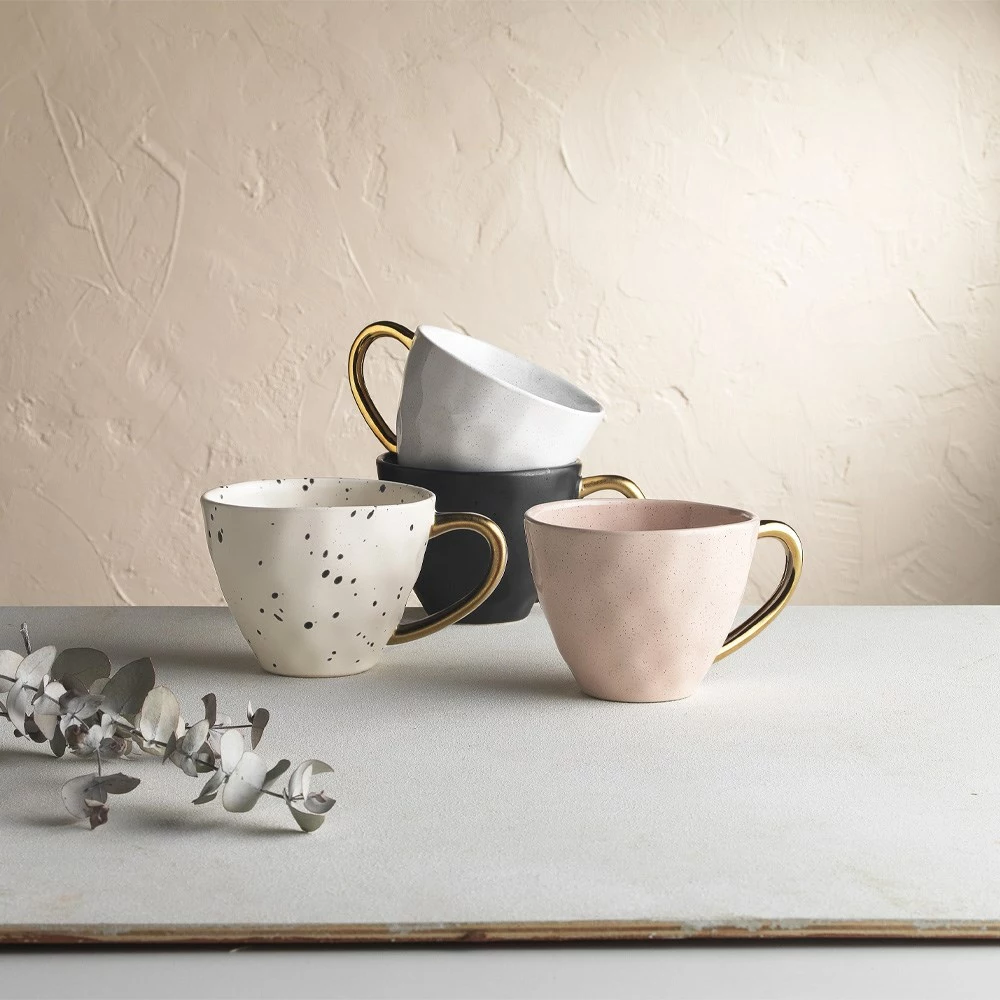 The Ecology Speckle Set of 4 380ml Mugs Gold takes everyday pieces of tableware and showers then with a sprinkle of glamour. Bringing a luxurious element to the simple act of sipping on a freshly made hot beverage, the Ecology Speckle Set of 4 380ml Mugs Gold both enhance your early morning tea and reinvents a freshly brewed after-dinner caffeine hit. With an assortment of chic colours, this set of mugs showcase an artisan dimpled texture completed with a reactive glaze for a truly unique speckled surface. With a mix of matte and gloss finishes, the stunning gold painted handles tie this set together to make an impactful visual whether used individually or displayed on the tabletop in unison. Crafted from durable stoneware, the Ecology Speckle Set of 4 380ml Mugs Gold makes a fabulous gift for house warmings and other special occasions, that’s if you don’t fall in love with them yourself first!
