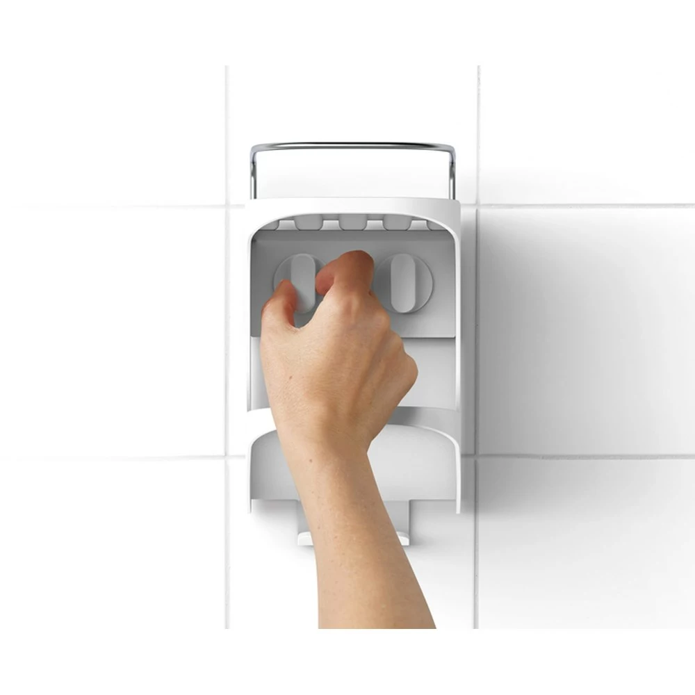 The perfect storage solution for when space is tight, the slimline Joseph Joseph Capsule 2-tier Shower Shelf White fits into compact showers to keep a variety of bottles and other shower essentials within easy reach. The Joseph Joseph Capsule 2-tier Shower Shelf White features a self-draining top shelf with a stainless-steel rail for standing bottles of shampoo and conditioner or a bar of soap. The angled, easy-load pocket provides easy access to bottles, while the dual hooks offer a spot to hang sponges, razors and other shower accessories. Easy to install, it requires no tools and does not damage walls or tiles, making it a fantastic option for rented accommodation. Powerful, super-grip suction cups attach smoothly to tiles or glass and allow the shelf to be repositioned as desired. The Joseph Joseph Capsule 2-tier Shower Shelf White is a great way to keep a small bathroom fully organised.