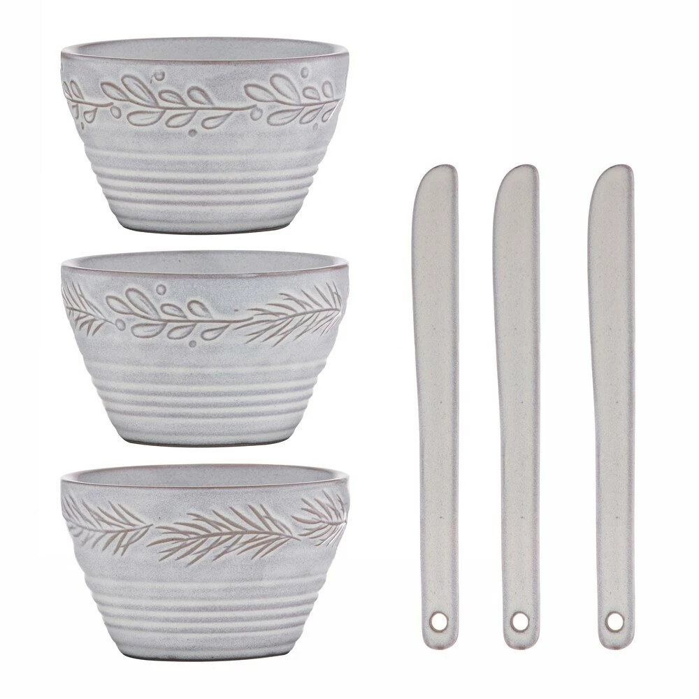 Craft a cosy and inviting dining atmosphere with the tastefully designed Croft 6 Piece Bowl and Spreader Set from Ladelle. Exclusively designed by Ladelle, the Croft 6 Piece Bowl and Spreader Set is made from durable stoneware that will last a lifetime. A delicate rosemary and olive leaf pattern in soft and gentle hues of blue and grey decorate a classic coconut backdrop to create a stunning tabletop centrepiece. This spreader set makes a practical yet stylish dining table accessory for serving delicious dips along side crusty bread and crackers. With a contemporary matte reactive glaze, the set slots effortlessly into your existing tableware collection while standing proud as a testament to its unique charm. With its stylish boxed packaging, the Ladelle Croft 6 Piece Bowl and Spreader Set is an easy yet thoughtful gift for any occasion.