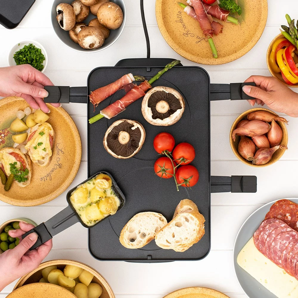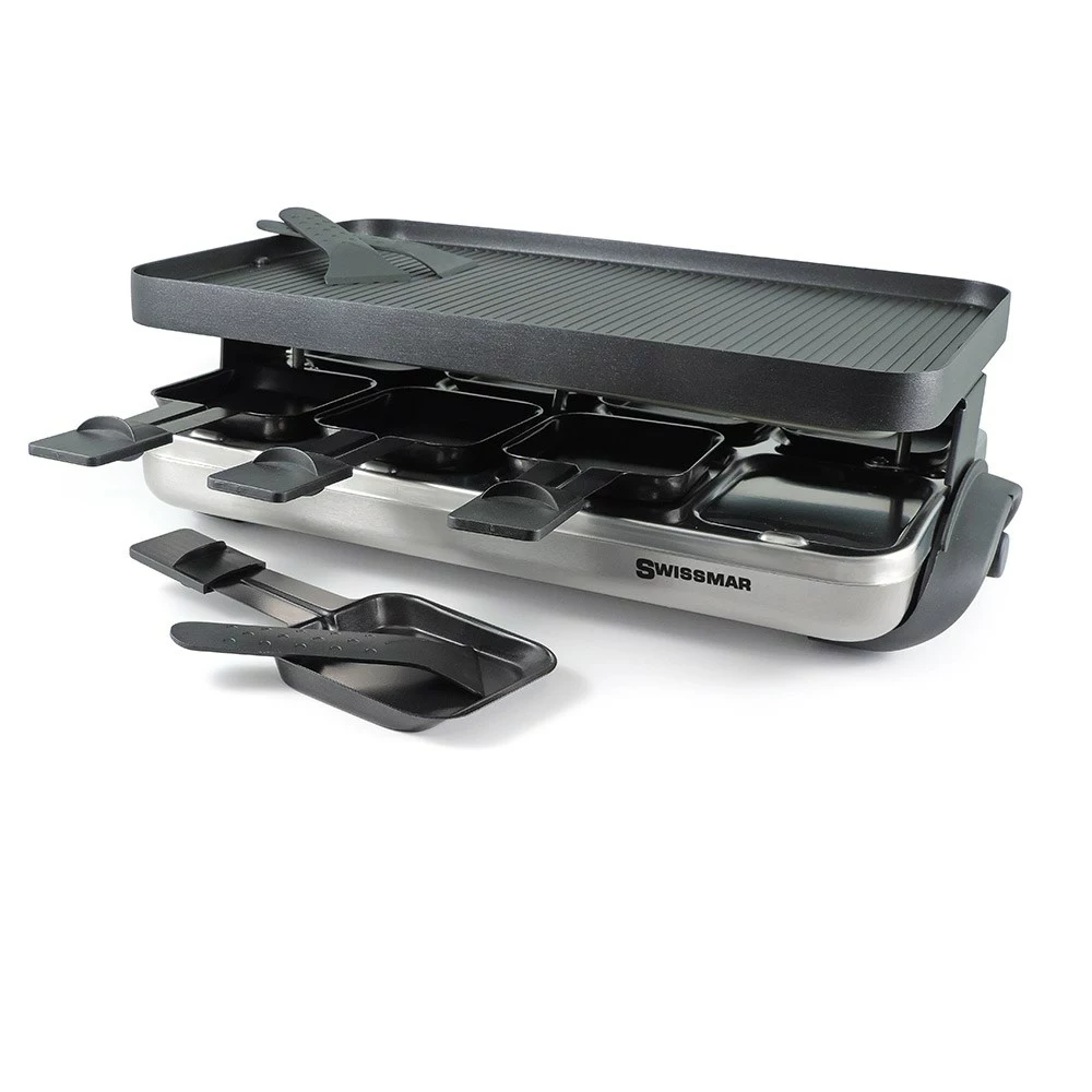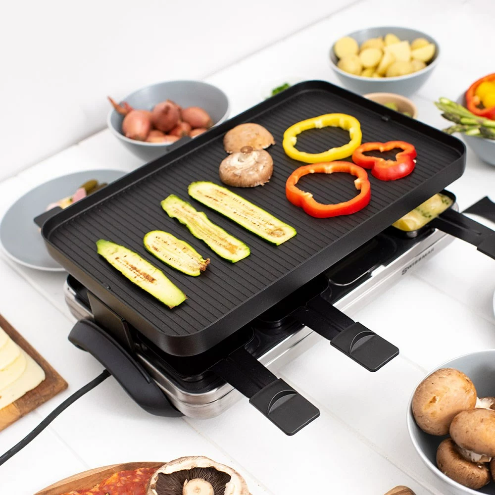 - Comes equipped with eight heat-resistant spatulas, eight non-stick coasted raclette dishes with thumb guards and a reversible cooktop