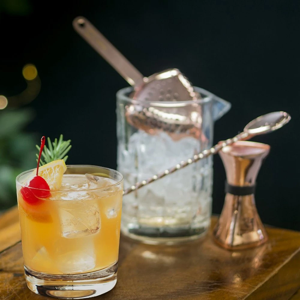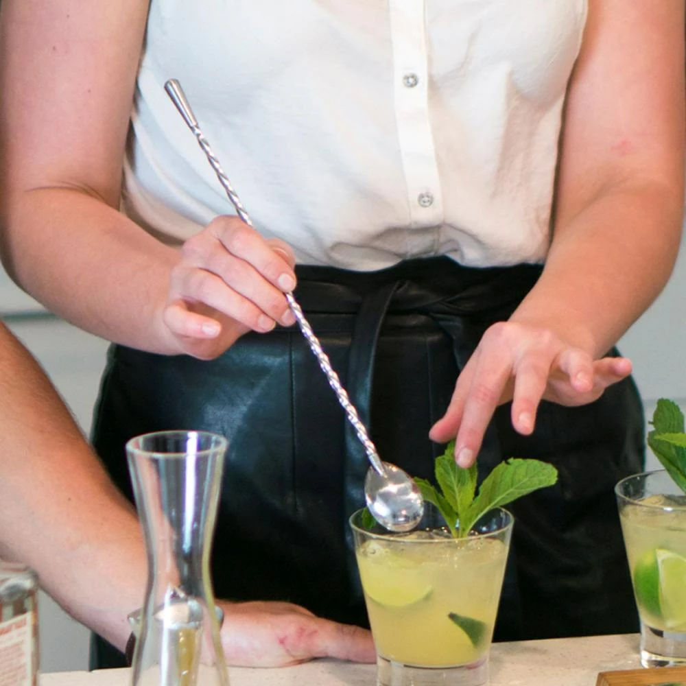 - Includes cocktail shaker, teardrop spoon, strainer, juliep, and spirit measure